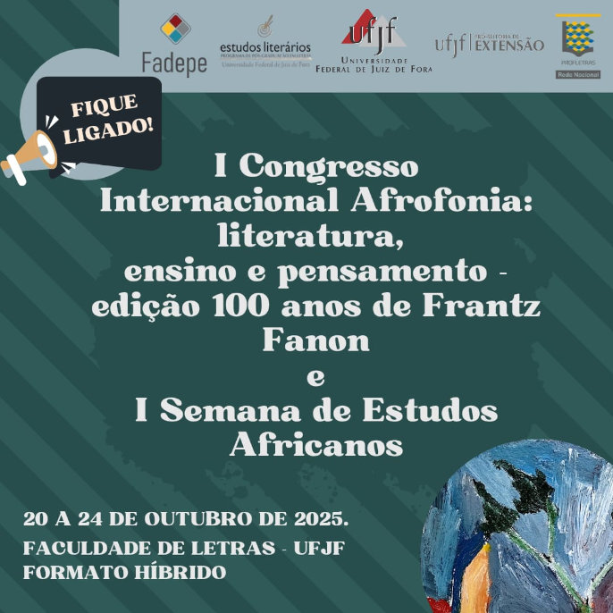 A “Primeira Semana de Estudos Africanos da Faculdade de Letras da UFJF e I Congresso Internacional Afrofonia: literatura, ensino e pensamento - edição 100 anos de Frantz Fanon” nasceram a partir da convergência de pesquisas sobre as literaturas africanas e suas diásporas, de docentes vinculados ao programa de pós-graduação PROFLETRAS - Mestrado profissional em Letras da Faculdade de Letras da Universidade Federal de Juiz de Fora e ao Programa de Pós-Graduação em Letras: Estudos Literários, da Faculdade de Letras da Universidade Federal de Juiz de Fora. O congresso tem como propósito congregar professores universitários, pesquisadores e estudiosos de Literaturas Africanas e suas diásporas, a fim de divulgar as pesquisas acadêmicas e, também, aquelas aplicadas ao ensino. A primeira edição do congresso coincide com o centenário de nascimento do importante investigador da área, Frantz Fanon, a quem será dedicado ao menos um simpósio temático, palestras e mesas de debate. Outrossim, o evento tem em seu nome, “Afrofonia”, a reverberação da existência africana nos muitos espaços geográficos do globo e na presença desse continente no trabalho acadêmico e escolar, como forma de conscientização da contribuição do povo africano à História do mundo. A semana de estudos africanos e o congresso estão previstos para ocorrer entre os dias 20 e 24 de outubro de 2025, na Faculdade de Letras da UFJF.