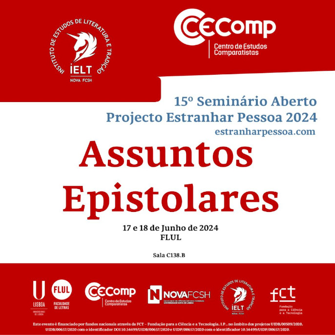 Realiza-se nos dias 17 e 18 de junho na Faculdade de Letras da Universidade de Lisboa o 15º Seminário do Projeto Estranhar Pessoa (Assuntos Epistolares).