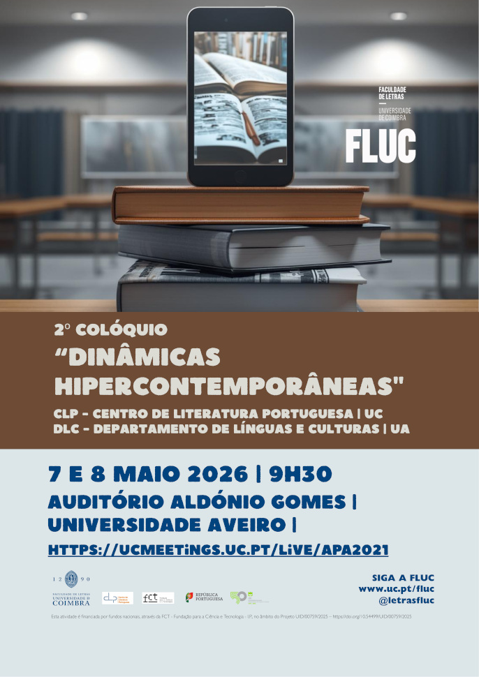 O Centro de Literatura Portuguesa da Universidade de Coimbra (CLP/UC) e o Departamento de Línguas e Culturas da Universidade de Aveiro (DLC/UA) promovem o 2º Colóquio "Dinâmicas Hipercontemporâneas", nos dias 7 e 8 de maio de 2026, a partir das 9h30, no Auditório Aldónio Gomes da Universidade de Aveiro.