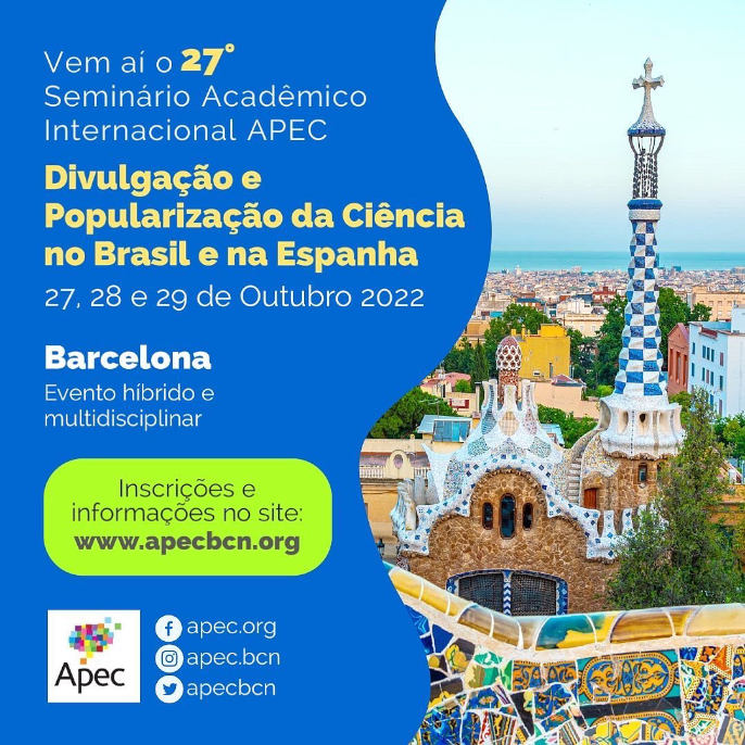 A Associação de Pesquisadores/as e Estudantes Brasileiros/as na Catalunha (APEC) convida professores/as, pesquisadores/as, estudantes de pós-graduação e de graduação, do 27º. Seminário Acadêmico Internacional da APEC, "Divulgação e Popularização da Ciência no Brasil e na Espanha", de 26 a 28 de outubro, em formato híbrido.