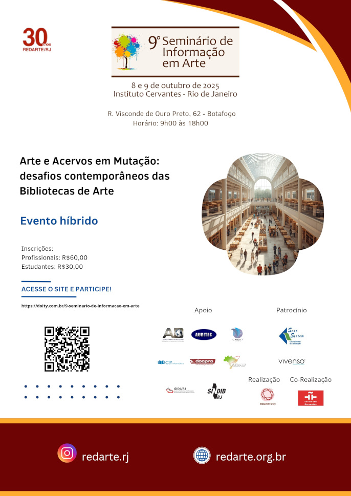 A Rede de Bibliotecas e Centros de Informação em Arte no Estado do Rio de Janeiro (REDARTE/RJ) convida para o 9º Seminário de Informação em Arte, que se realizará nos dias 8 e 9 de outubro, das 9h às 18h, no auditório do Instituto Cervantes o Rio de Janeiro, em Botafogo.