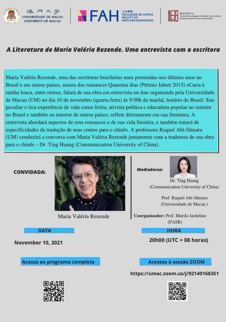 Um webinário aberto e em direto, organizado pelo Centro de Investigação para Estudos Luso-Asiáticos (CIELA), da Faculdade de Letras, Universidade de Macau, em colaboração com o Prof. Murilo Jardelino (FASB). Evento consistirá numa entrevista à autora brasileira, mediada pelas Profas. Raquel Abi-Sâmara (Universidade de Macau) e Ting Huang - tradutora para chinês de Maria Valéria Rezende.