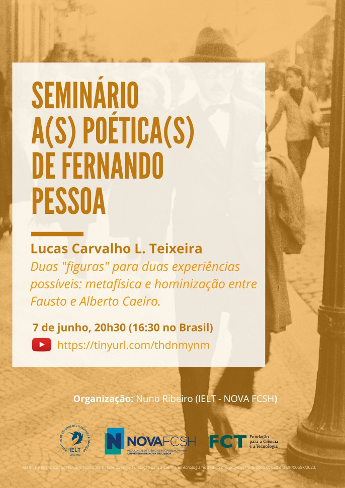 Esta sessão terá como orador Lucas Carvalho L. Teixeira que irá apresentar a comunicação Duas “figuras” para duas experiências possíveis: metafísica e hominização entre Fausto e Alberto Caeiro. Partindo de uma análise do Fausto e da poesia de Alberto Caeiro, a presente palestra procurará explorar duas experiências possíveis na obra de Fernando Pessoa, tendo por base os conceitos de metafísica e hominização. O encontro será transmitido no Youtube pelas às 20h30 (16h30 no Brasil) e é organizado pelo investigador Nuno Ribeiro.