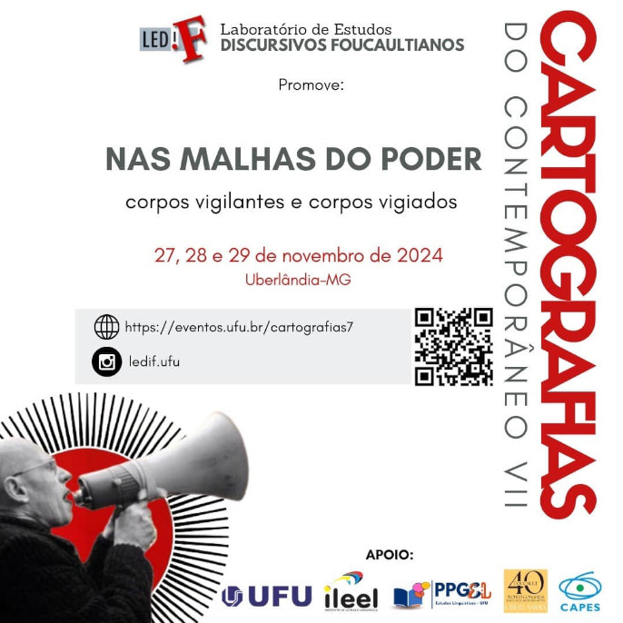 A Universidade Federal de Uberlândia (UFU) sediará, de 27 a 29 de novembro de 2024, a 7ª edição do "Cartografias do Contemporâneo". Este evento reúne grupos de pesquisa dedicados aos Estudos Discursivos Foucaultianos, especialmente no Brasil. A organização está a cargo do Laboratório de Estudos Discursivos Foucaultianos (LEDIF), com apoio da Capes, ILEEL e PPGEL da UFU.
