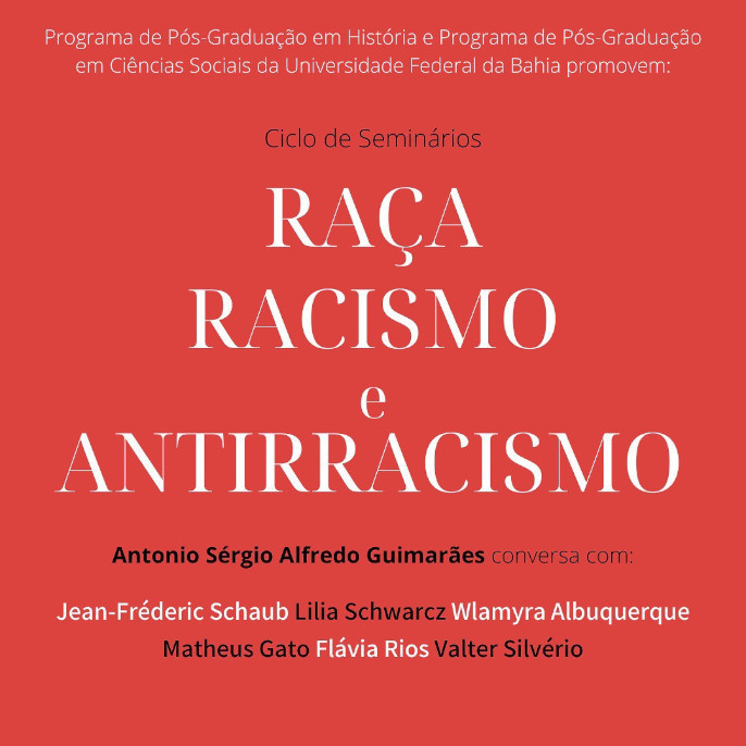O Programa de Pós Graduação em História e o Programa de Pós Graduação em Ciências Sociais da UFBA promovem o Ciclo de Seminários Raça, Racismo e Antirracismo. O professor Antonio Sérgio Alfredo Guimarães (USP/UFBA) recebe seis palestrantes que irão refletir sobre o conceito de raça nas Ciências Sociais e na História.