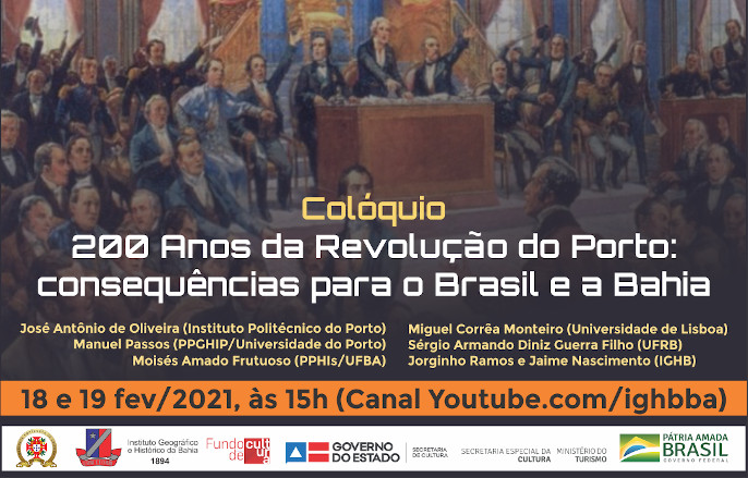Nos dias 18 e 19 de fevereiro de 2021, a partir das 15h, pelo canal youtube.com/ighbba, o Instituto Geográfico e Histórico da Bahia e o Gabinete Português de Leitura promovem o “Colóquio 200 Anos da Revolução do Porto: consequências para o Brasil e a Bahia”. A proposta é reunir pesquisadores brasileiros e portugueses para compartilhar com o público as impressões sobre o evento que deu início ao processo que culminou na Independência do Brasil.