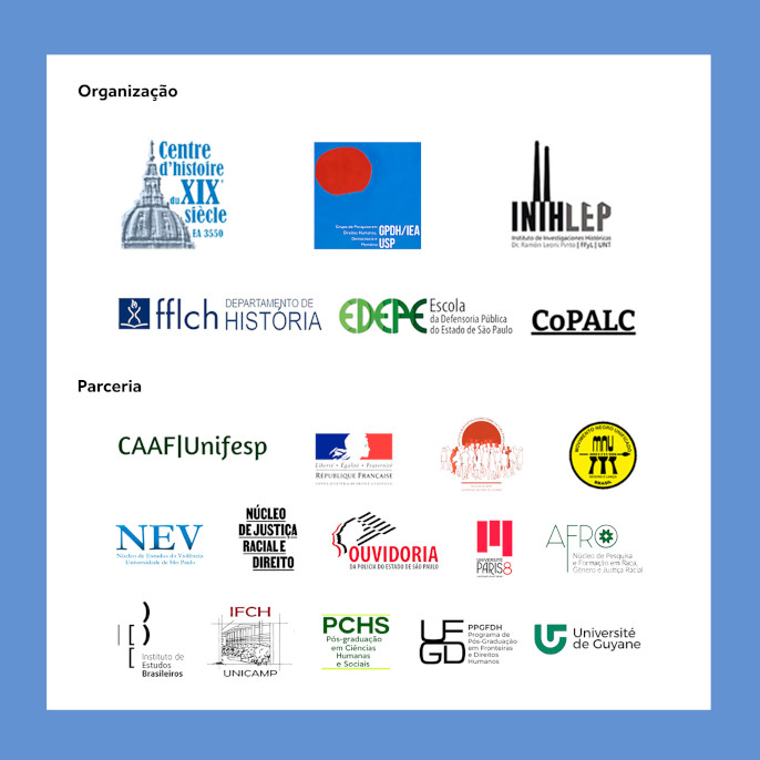 Institut des Amériques (IdA); Grupo de Pesquisa em Direitos Humanos, Democracia e Memória do Instituto de Estudos Avançados da Universidade de São Paulo (GPDH-IEA/USP); Grupo de Pesquisa Colonização Penitenciária na América Latina e Caribe (CoPALC); Université de Guyane; Instituto Beja; Consulado Geral da França em São Paulo; Centre d’Histoire du XIX’siècle UR 3550 (Paris Panthéon-Sorbonne/Sorbonne-Université); Programa de Pós- Graduação em Ciência Política da UNICAMP (PPGCP/Unicamp); Programa de Pós-Graduação em Ciências Humanas e Sociais (PCHS/UFABC); PPGFDH/UFGD; Culturas e Identidades Brasileiras (IEB-USP); Philosophie/Univ. Paris 8; Núcleo de Justiça Racial e Direito da FGV; Ouvidoria das Policias do Estado de São Paulo; Movimento Negro Unificado (MNU); Escola Superior da Defensoria Pública do Estado de São Paulo; Afro CEBRAP; Núcleo de Estudos da Violência da USP (NEV); Instituto de Investigaciones Históricas Leoni Pinto (INIHLEP-UNT); Instituto de Investigaciones sobre Cultura Popular (IICP-UNT); Departamento de História da FFLCH-USP. Centro de Antropologia e Arqueologia Forense (CAAF-UNIFESP); University of British Columbia (CCIE and GRSJ).