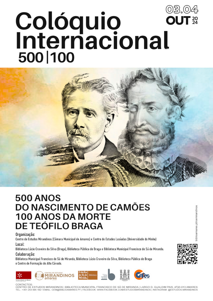 Assim, no ano em que se comemoram 500 anos do nascimento de Camões e 100 da morte de Teófilo Braga, o Colóquio Internacional 500/100. 500 anos do nascimento de Camões. 100 da morte de Teófilo Braga tem como objetivo abrir um espaço de partilha e discussão a partir da revisitação da obra destes dois vultos da cultura portuguesa, à luz de pressupostos teóricos atuais e de novas abordagens críticas.