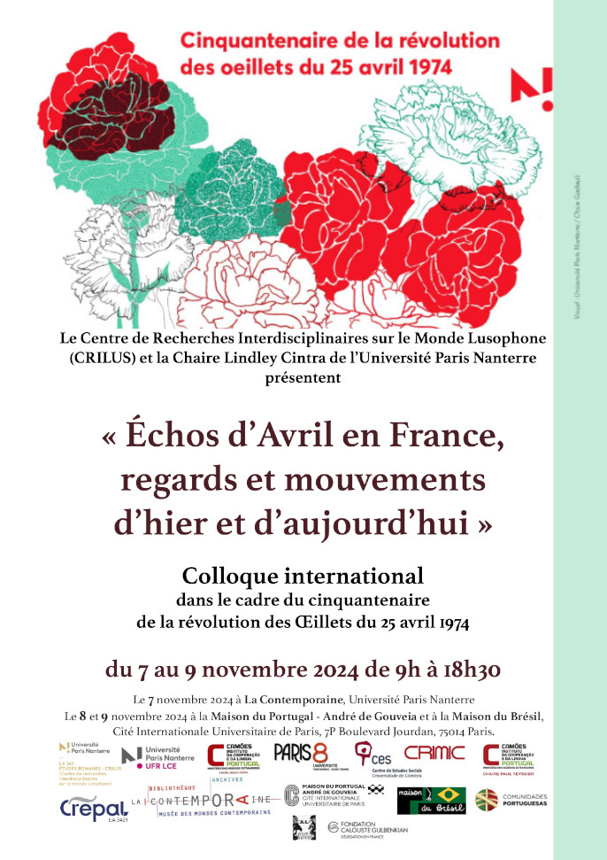 Entre os dias 7 e 9 de novembro de 2024, em Paris, o Centre de Recherches Interdisciplinaires sur le monde Lusophone (CRILUS) e a Cátedra Lindley Cintra da Universidade Paris-Nanterre promovem o colóquio internacional “Échos d’Avril en France.” No ano do cinquentenário da Revolução dos Cravos, o evento explora a transição da ditadura para a democracia em Portugal e reflete sobre movimentos de resistência e de memória.