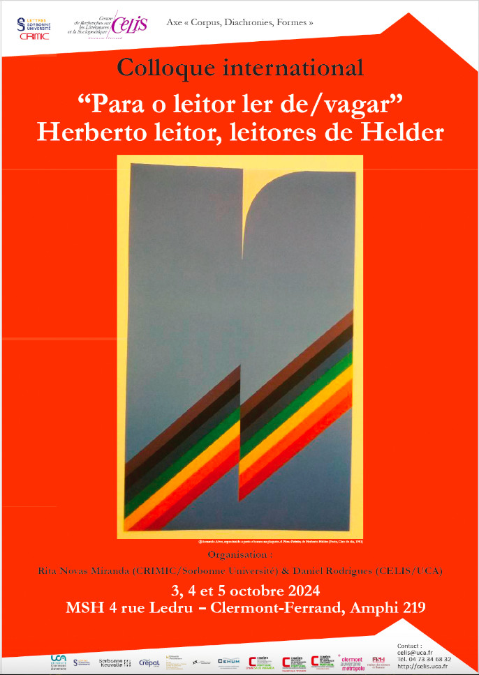 O Colóquio internacional “Para o leitor ler de/vagar” – Herberto leitor, leitores de Helder, organizado pelo CELIS (Centre de recherches sur les littératures et la Sociopoétique) e o CRIMIC (Centre de recherches interdisciplinaires sur les mondes ibéro-américains contemporains), constrói-se sobre dois eixos temáticos: a forma através da qual o poeta transforma a constelação de autores que vão constituindo o seu universo poético na obra (“poético” usado aqui no seu sentido primeiro e mais abrangente de “poiesis”) ; o segundo, sobre a incorporação – e poderíamos mesmo dizer a criação, pensando no sentido que Maurice Blanchot atribui à noção de “reescrita” – da obra por outros leitores, sejam eles críticos, artistas ou escritores.