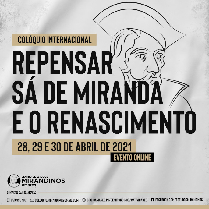 O Centro de Estudos Mirandinos (CEM) convida à apresentação de propostas de comunicação no Colóquio Internacional Repensar Sá de Miranda e o Renascimento, que terá lugar online nos dias 28, 29 e 30 de abril de 2021. Visa-se com este colóquio revisitar criticamente a obra do grande escritor, nas suas várias modalidades expressivas e na riqueza dos caminhos temáticos que nela se percorrem, bem como analisar, em sede tanto filosófica como estética, o Renascimento enquanto expressão de uma nova forma de conceber e ver o mundo.