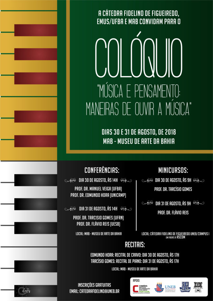 A Cátedra Fidelino de Figueiredo – Instituto Camões/UNEB vai realizar o Colóquio Música e Pensamento: Maneiras de ouvir a Música nos dias 30 e 31 de agosto, no Campus I da UNEB e no Museu de Arte da Bahia (MAB), em Salvador.