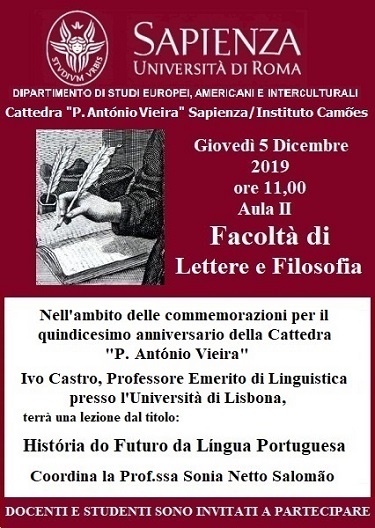 Esta palestra organizar-se-á no âmbito das comemorações dos 15 anos da Cátedra Padre António Vieira em Roma, e tomará lugar na Universidade de Sapienza em Roma – concretamente na Faculdade de Letras e Filosofia –, sendo dirigida por Sónia Netto Salomão.