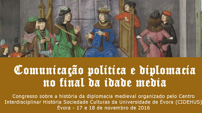 Com o Encontro “Comunicação política e diplomacia no final da Idade Média”, que terá lugar na Universidade de Évora nos dias 17 e 18 de novembro de 2016, pretende-se realizar um estado da questão da história da diplomacia medieval, uma temática em processo de renovação metodológica, tendo em atenção aspetos como as novas tendências historiográficas, a grande diversidade de fontes disponíveis (literatura, arquivos, correspondencia…), a sociologia dos protagonistas (eclesiásticos, nobres, letrados, mercadores…) e os diversos contextos políticos que exerceram diplomacia (papado, reinos, cidades…). Para tal reuniram-se alguns dos principais especialistas europeus, protagonistas dessa renovação historiográfica, bem como jovens investigadores portugueses e espanhóis com projetos em curso na área financiados pelo Governo de Portugal.