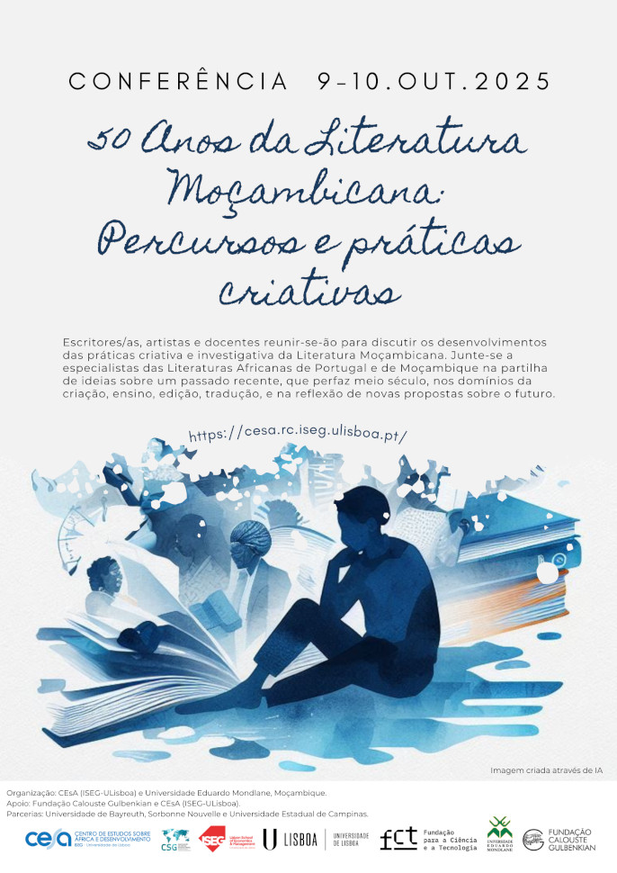 No ano em que se comemoram 50 anos da criação curricular das Literaturas Africanas na Universidade Portuguesa (FLUL-ULisboa) esta Conferência, programada para dois dias, promovida pelo CEsA – Centro de Estudos sobre África e Desenvolvimento (CSG/ISEG-ULisboa), em parceria e colaboração organizativa com a Universidade Eduardo Mondlane (UEM) de Moçambique, será constituída por quatro mesas-redondas temáticas. Vai integrar simultaneamente escritores/as, artistas, docentes universitários de Portugal e de Moçambique, a fim de apresentar e discutir os desenvolvimentos nas prática criativa e investigativa das literaturas africanas, centralizando-se na discussão e desenvolvimento em torno da Literatura Moçambicana ao longo de cinquenta anos – enquanto exemplo singular no quadro das literaturas africanas de língua portuguesa – e suas propostas para o futuro. Integraremos também a colaboração de especialistas de Literaturas Africanas, em especial da Literatura Moçambicana, em parceria com Universidades europeias (Bayreuth e Sorbonne Nouvelle) e brasileiras (Unicamp – Universidade Estadual de Campinas).