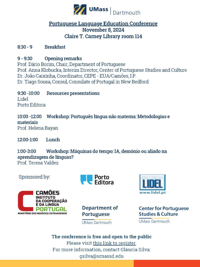 On Friday November 8, from 9 am to 3 pm, in partnership with the Department of Portuguese and Coordenação do Ensino Português - EUA/Camões, I.P., we’re presenting the 2024 edition of our annual Portuguese Language Education Conference, first held at UMass Dartmouth in 2002 and since 2006 organized by Prof. Gláucia Silva. The conference is free and open to the public, but please register using the link above.