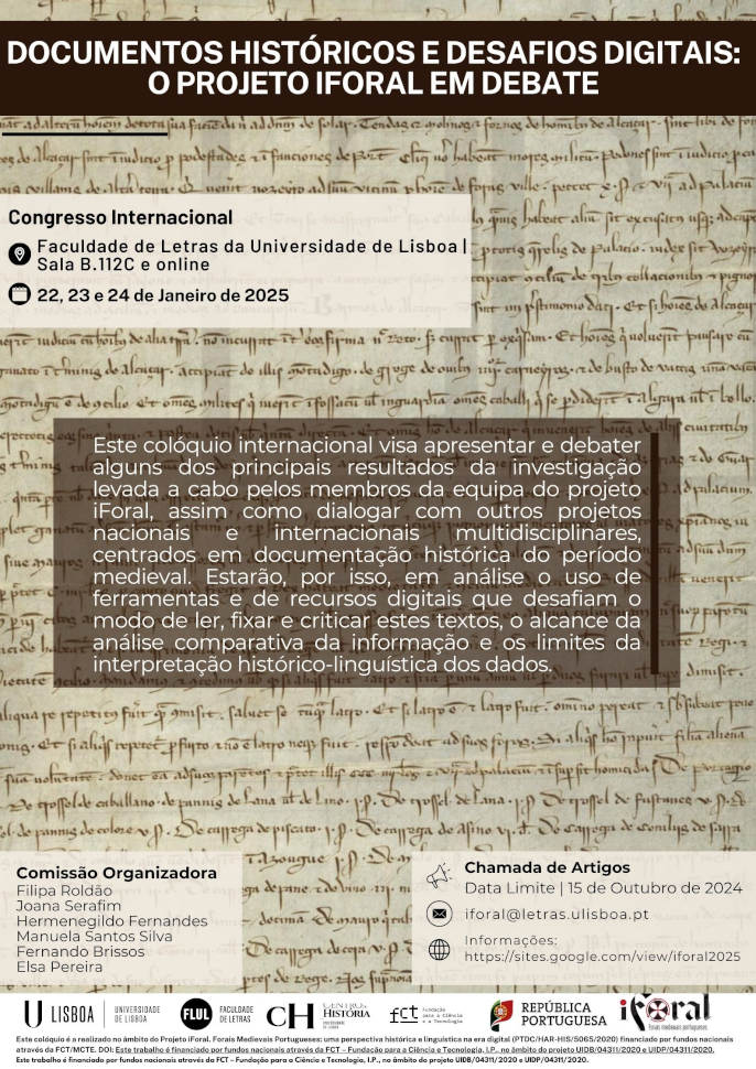 Este colóquio internacional visa apresentar e debater alguns dos principais resultados da investigação levada a cabo pelos membros da equipa do projeto iForal, assim como dialogar com outros projetos nacionais e internacionais multidisciplinares, centrados em documentação histórica do período medieval. Estarão, por isso, em análise o uso de ferramentas e de recursos digitais que desafiam o modo de ler, fixar e criticar estes textos, o alcance da análise comparativa da informação e os limites da interpretação histórico-linguística dos dados.