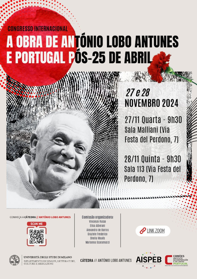 O evento, a decorrer nos dias 27 e 28 de novembro de 2024, com transmissão online pelo Zoom, reunirá especialistas e interessados na Universidade de Milão para explorar a relação entre a literatura de Lobo Antunes e as transformações sociopolíticas portuguesas após a Revolução de Abril. O evento contará com painéis, debates e apresentações sobre temas centrais da obra do autor, abordando aspetos literários, históricos e culturais.