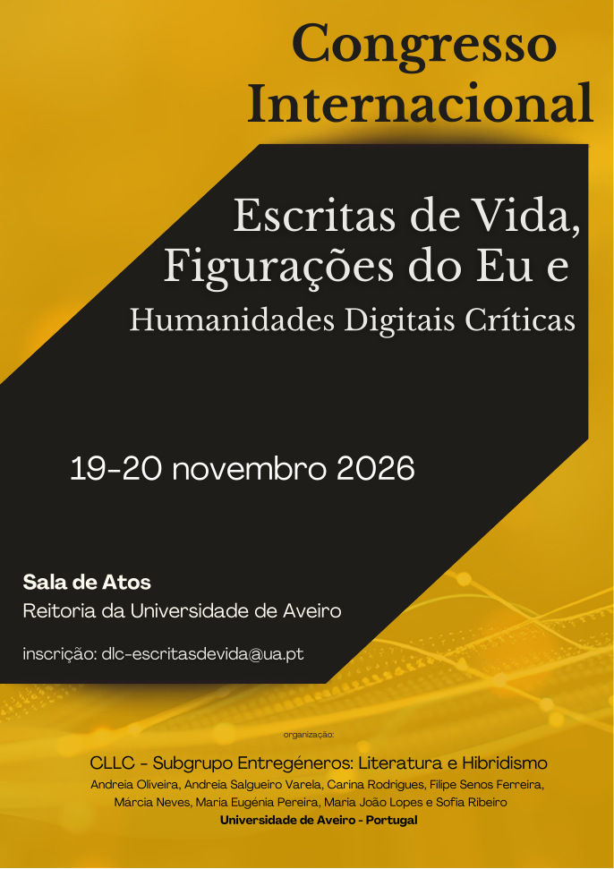 O Centro de Línguas, Literaturas e Culturas da Universidade de Aveiro (CLLC) promove, nos dias 19 e 20 de novembro de 2026, o Congresso Internacional Escritas de Vida, Figurações do Eu e Humanidades Digitais Críticas, na Sala de Atos da Reitoria da Universidade de Aveiro. O evento é organizado pelo Subgrupo Entregéneros: Literatura e Hibridismo e conta com financiamento da Fundação para a Ciência e a Tecnologia (FCT).