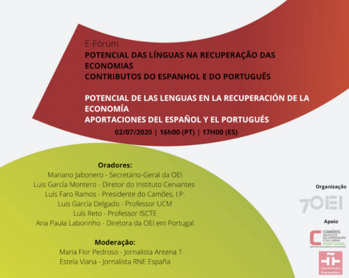 No próximo dia 2 de julho, às 16h00 (hora de Lisboa, 17h00 de Madrid), a Organização de Estados Ibero-americanos para a Educação, a Ciência e a Cultura (OEI) realizará o encontro virtual intitulado e-Fórum2020 Potencial das línguas na recuperação das economias: contributos do espanhol e do português, em parceria com o Instituto Cervantes de Espanha e o Camões - Instituto da Cooperação e da Língua, I.P..