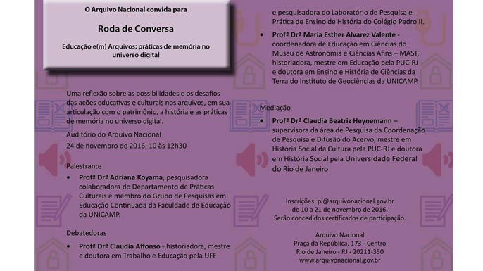 O encontro Roda de Conversa, Educação e(m) Arquivos: práticas de memória no universo digital acontece no dia 24 de novembro, no auditório principal da sede do Arquivo Nacional, no Rio de Janeiro. O evento tem como objetivo uma reflexão sobre as possibilidades e os desafios das ações educativas e culturais nos arquivos, em sua articulação com o patrimônio, a história e as práticas de memória no universo digital.