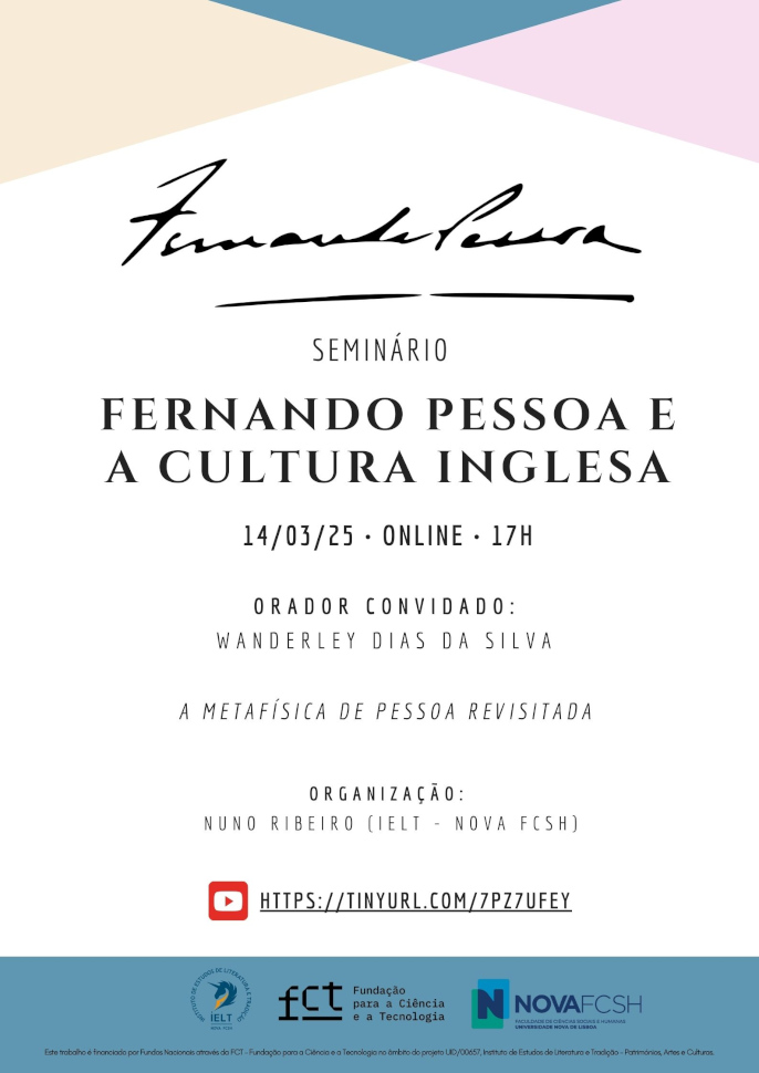 A sexta sessão do seminário Fernando Pessoa e a Cultura Inglesa realiza-se dia 14 de março com transmissão em direto no Youtube.
