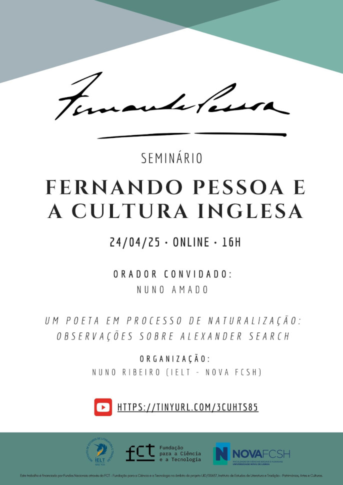 A sétima sessão do seminário Fernando Pessoa e a Cultura Inglesa realiza-se dia 24 de abril com transmissão em direto no Youtube. O palestrante desta sessão é Nuno Amado com a comunicação Um poeta em processo de naturalização: observações sobre Alexander Search. A organização está a cargo de Nuno Ribeiro.