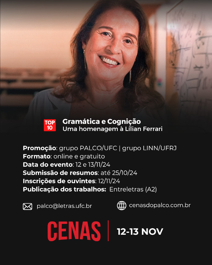 Grupo de Pesquisa PALCO - Pesquisas em Linguística e Cognição - UFC e Grupo LInc - Laboratório de Pesquisas em Linguística Cognitiva - UFRJ promovem a terceira edição do Cenas do Palco, evento 100% online e gratuito, que reúne anualmente pesquisadores interessados em discutir a relação entre linguagem e cognição.