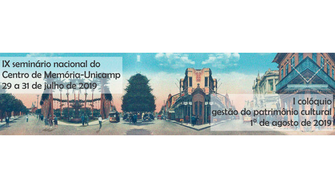O Centro de Memória – Unicamp tem o prazer de convidar a comunidade acadêmica, profissionais ligados a escolas, museus, arquivos, associações e instituições diversas, e demais interessados para o IX Seminário Nacional do CMU e para o I Colóquio Gestão do Patrimônio Cultural, que acontecerá no período de 29 a 31 de julho e 1º de agosto de 2019, na Universidade Estadual de Campinas (UNICAMP), nas dependências da Faculdade de Educação. O IX Seminário Nacional tem por tema central “Memória e histórias locais: esquecimento, diversidades culturais e identidades”; o I Colóquio escolheu para o sua primeira edição o tema: “Projetos culturais e acervos”.