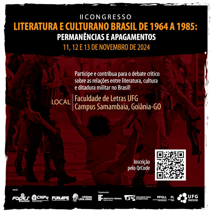 Nos dias 11, 12 e 13 de novembro de 2024 ocorrerá na Faculdade de Letras da UFG, em Goiânia, o II Congresso Literatura e Cultura no Brasil de 1964 a 1985: permanências e apagamentos.