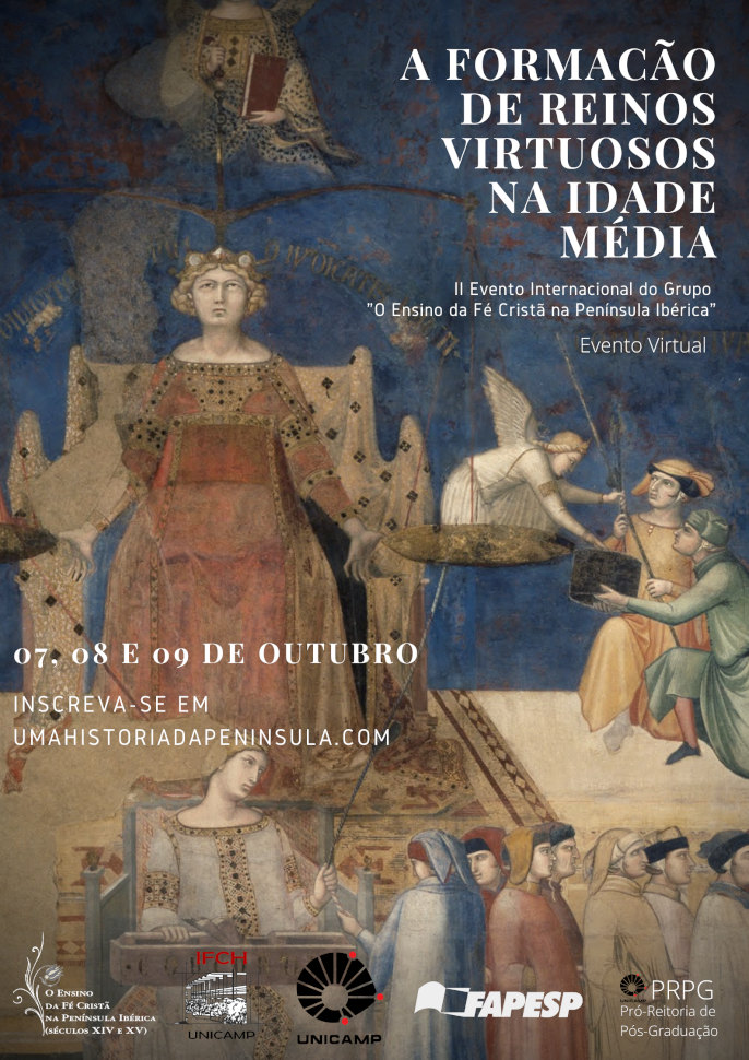 Estão abertas as inscrições para o II Evento Internacional "A formação de reinos virtuosos na Idade Média", que ocorrerá entre os dias 07 e 09 de outubro de 2020. O evento, organizado pelo grupo de Pesquisa "O Ensino da Fé Cristã na Península Ibérica", da Unicamp, será completamente online, gratuito e emitirá certificados para os ouvintes com participação igual ou superior a 75%.