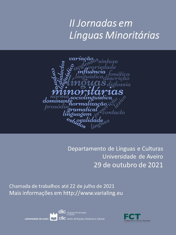 Realiza-se no dia 29 de outubro de 2021, no Centro de Línguas, Literaturas e Culturas da Universidade de Aveiro, as II Jornadas em Línguas Minoritárias, que pretendem aprofundar temáticas relacionadas com a investigação nessas línguas no âmbito da descrição, prescrição e normalização, com foco em contacto linguístico, influência da língua dominante, descrição gramatical, estudos fonéticos, estudos prosódicos e aspetos sociolinguísticos.