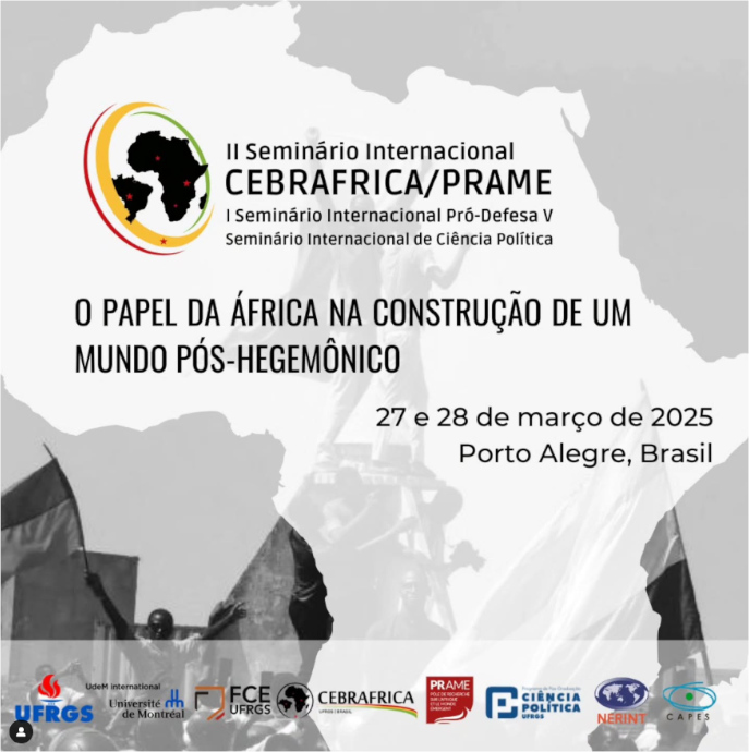 O Centro Brasileiro de Estudos Africanos (Cebrafrica)/UFRGS, em colaboração com o Pôle de Recherche sur l’Afrique et le Monde Émergent (Prame)/ Universidade de Montreal, e o Programa de Pós-Graduação em Ciência Política/UFRGS convidam professores, pesquisadores, pós-graduandos, graduandos, profissionais e interessados nos Estudos Africanos para o II Seminário Internacional CEBRAFRICA/PRAME, o I Seminário Internacional Pró-Defesa V e o Seminário Internacional de Ciência Política a ser realizado na Universidade Federal do Rio Grande do Sul, Porto Alegre, Brasil, nos dias 27 e 28 de março de 2025. O evento conta com o apoio do Núcleo Brasileiro de Estratégia e Relações Internacionais (Nerint)/UFRGS.
