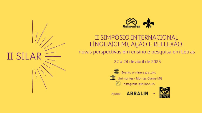 II Simpósio Internacional Língua(gem), Ação e Reflexão: novas perspectivas em ensino e pesquisa em Letras - SILAR - que ocorrerá entre os dias 22 e 24 de abril de 2025, no formato on-line, terá como tema, nesta 2ª edição: “Novos diálogos, reflexões e saberes: perspectivas de pesquisas nas áreas de linguagens e literaturas”. O evento é uma proposição das Coordenações Didáticas dos Cursos de Letras Português, Espanhol e Inglês da Universidade Estadual de Montes Claros-MG, Brasil.