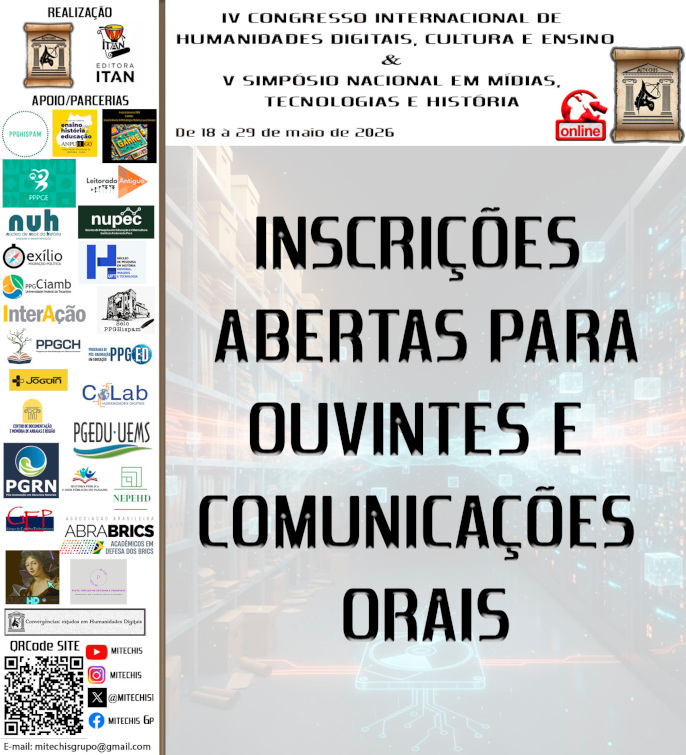 O Grupo de Pesquisa MITECHIS anuncia a abertura das inscrições para o IV Congresso Internacional de Humanidades Digitais, Cultura e Ensino (CIHDCE) e o V Simpósio Nacional em Mídias, Tecnologias e História (SNMTH) — eventos que ocorrerão de 18 a 29 de maio de 2026, em formato 100% online.