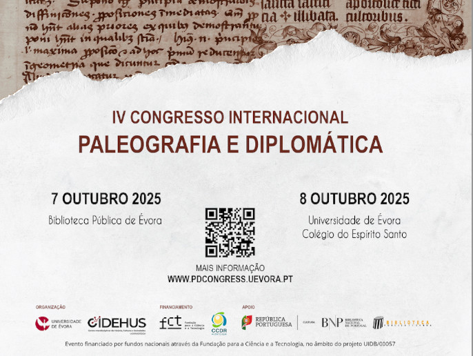Nos dias 7 e 8 de outubro de 2025, a cidade de Évora acolherá o IV Congresso Internacional de Paleografia e Diplomática, promovido pelo Centro Interdisciplinar de História, Culturas e Sociedades (CIDEHUS) – Universidade de Évora. O evento, que passa a realizar-se com periodicidade bienal, reúne investigadores, professores, estudantes e técnicos das áreas da Paleografia, Diplomática, Sigilografia, Codicologia, Arquivística, Filologia e outras disciplinas afins, com o intuito de debater os desafios e avanços actuais nestes domínios científicos.