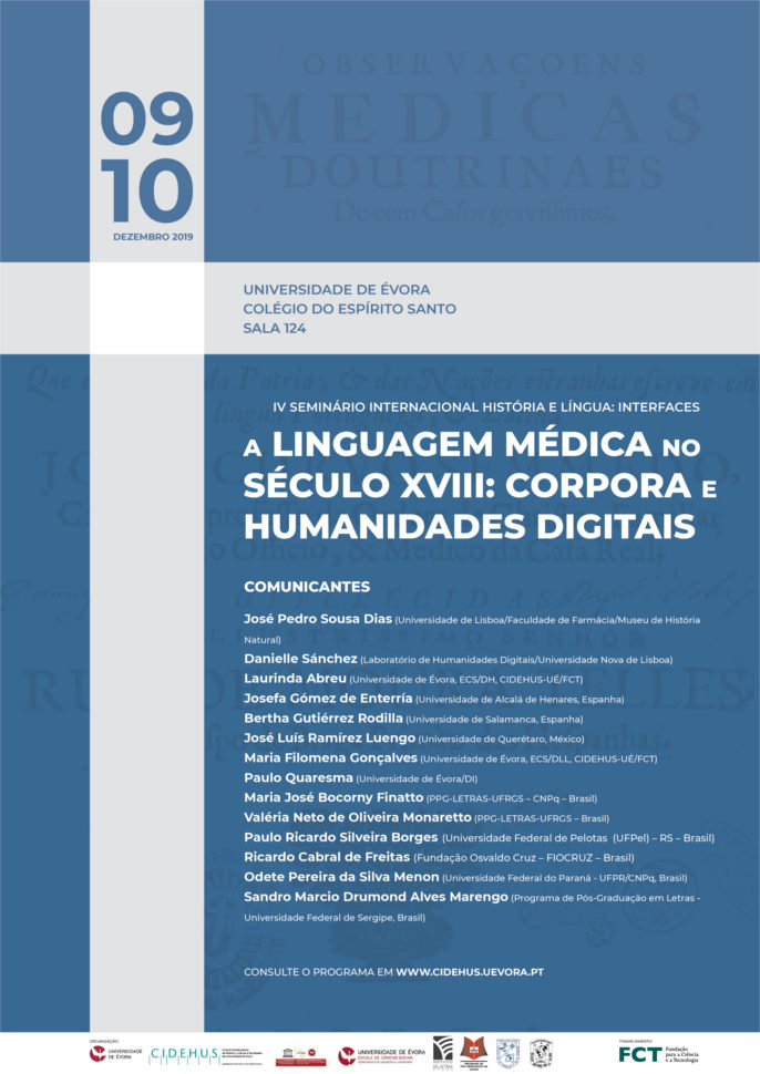 Decorrerá, nos dias 09 e 10 de Dezembro, o IV Seminário Internacional História e Língua: Interfaces, dedicado ao tema "A linguagem médica no século XVIII corpora e Humanidades Digitais", na Universidade de Évora.