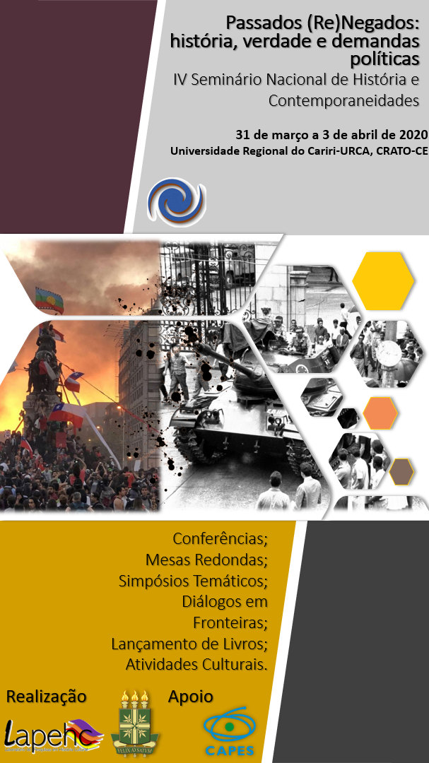 Em sua quarta edição, o Seminário Nacional de História e Contemporaneidades - Passados (re) negados: história, verdade e demandas políticas, será realizado entre os dias 31 de março e 3 de abril de 2020, na Universidade Regional do Cariri-URCA, Crato-Ce. Nessa edição, trazemos o debate sobre os desafios de refletirmos problemas relacionados ao fazer histórico e suas demandas políticas em meio às reedições e debates em torno da verdade, negacionismo e a profusão de sujeitos e narrativas históricas no cotidiano. Nesse sentido, o evento propõe pensar os ataques à produção do conhecimento histórico, a crise institucional e de autoridade pelas quais passa a produção do conhecimento, bem como, a compreensão sobre novos espaços de narrativa histórica.
