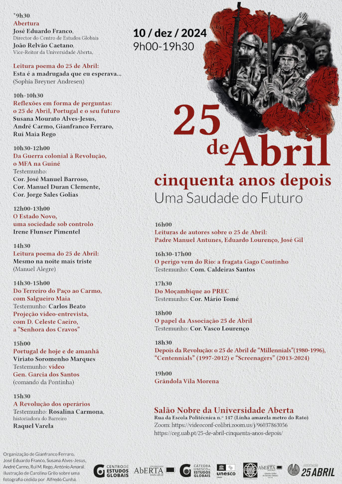 Realiza-se no próximo dia 10 de dezembro, às 9h00 (hora de Lisboa), a jornada 25 de Abril, cinquenta anos depois: Uma Saudade do Futuro, organizada pelo Centro de Estudos Globais, em cooperação com a Associação 25 de Abril.