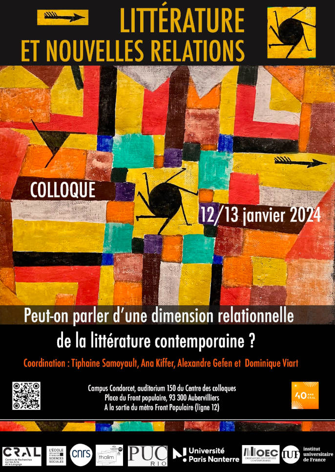 A literatura contemporânea desempenha um papel crucial na formação de relações concretas, como grupos de leitura, oficinas de escrita e eventos literários, em meio à crescente influência do digital. Em um contexto global, o desafio é questionar se essas dinâmicas relacionais podem definir o caráter "contemporâneo" da era literária atual. O colóquio «Littérature et nouvelles relations. Peut-on parler d’une dimension relationnelle de la littérature contemporaine?», promovido pelo Centre de recherches sur les arts et le langage (CRAL, EHESS-CNRS), explorará essa proposta, analisando sua aplicabilidade em espaços diferentes e distantes como França e o Brasil; examinando as obras e práticas literárias representativas, bem como possíveis obstáculos para essa classificação.