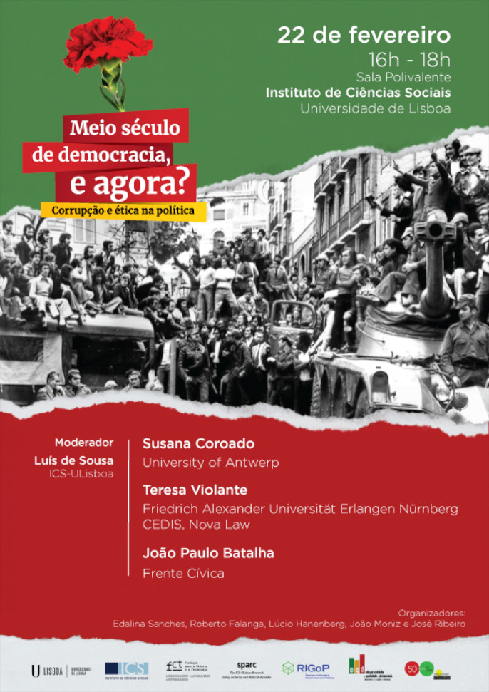 A primeira sessão do ciclo Meio século de democracia, e agora? acontece no dia 22 de fevereiro. Nesta sessão, a primeira de um ciclo de debates inseridos nas Comemorações dos 50 anos do 25 de Abril no ICS-ULisboa, o tema do debate será Corrupção e ética na política.