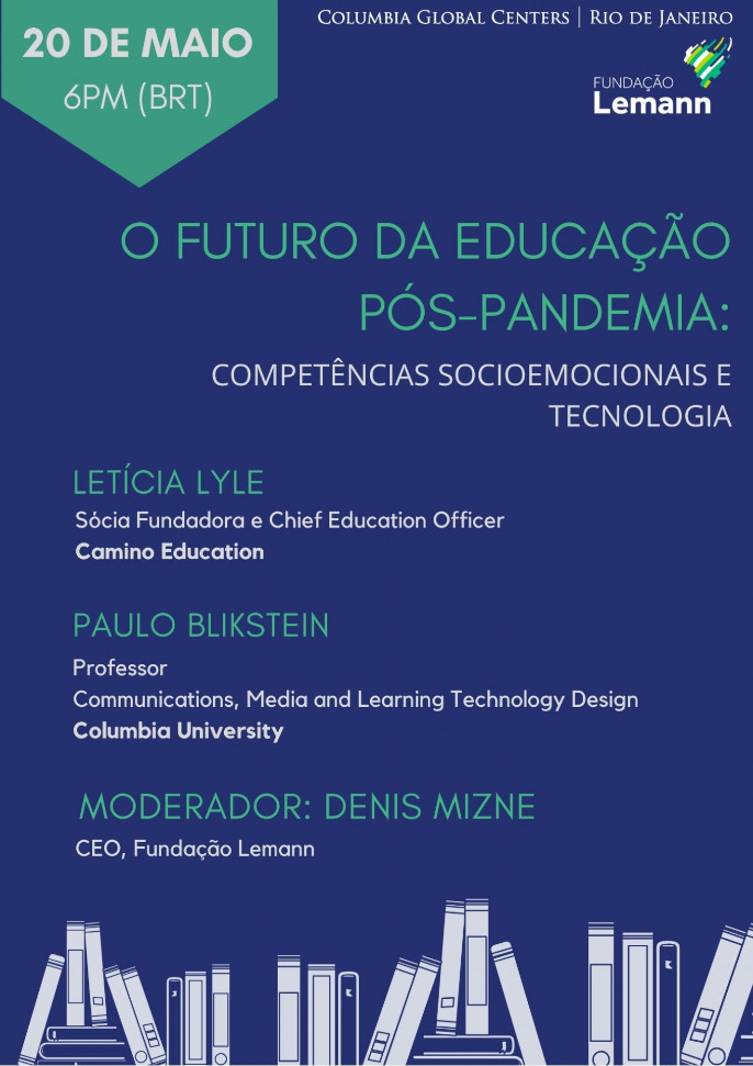Gostaríamos de convidá-lo para participar de mais um webinar com grandes nomes da Universidade de Columbia e parceiros do Columbia Global Centers | Rio de Janeiro. No dia 20 de maio às 18 horas (BRT), receberemos a Sócia Fundadora e Chief Education Officer no Camino Education, Letícia Lyle, e o Professor de Communications, Media and Learning Technology Design, Paulo Blikstein para um grande debate sobre o futuro da educação no Brasil. O debate será moderado por Denis Mizne, CEO na Fundação Lemann.