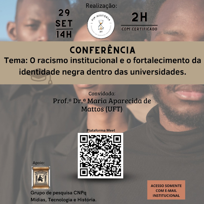 O programa de Inovação Pedagógica do Curso de História da Universidade Federal do Tocantins, coordenado pelo Prof. Dr. George Leonardo Seabra Coelho (PPGHispam-UFT), convida toda a comunidade acadêmica para prestigiar a conferência intitulada: "O racismo institucional e o fortalecimento da identidade negra dentro das universidades", com a participação da Prof. Dr. Maria Aparecida de Mattos. Essa atividade será organizada pelas discentes: Larissa de Oliveira, Anny Karoline e Gabriely Guilherme Bezerra.