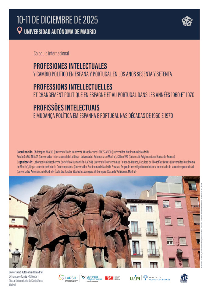Organização: Laboratoire de Recherche Sociétés & Humanités (LARSH), Université Polytechnique Hauts-de-France, Facultad de Filosofía y Letras (Universidad Autónoma de Madrid), Departamento de Historia Contemporánea (Universidad Autónoma de Madrid), Escalas. Grupo de investigación en historia conectada de la contemporaneidad (Universidad Autónoma de Madrid), École des hautes études hispaniques et ibériques (Casa de Velázquez, Madrid).
