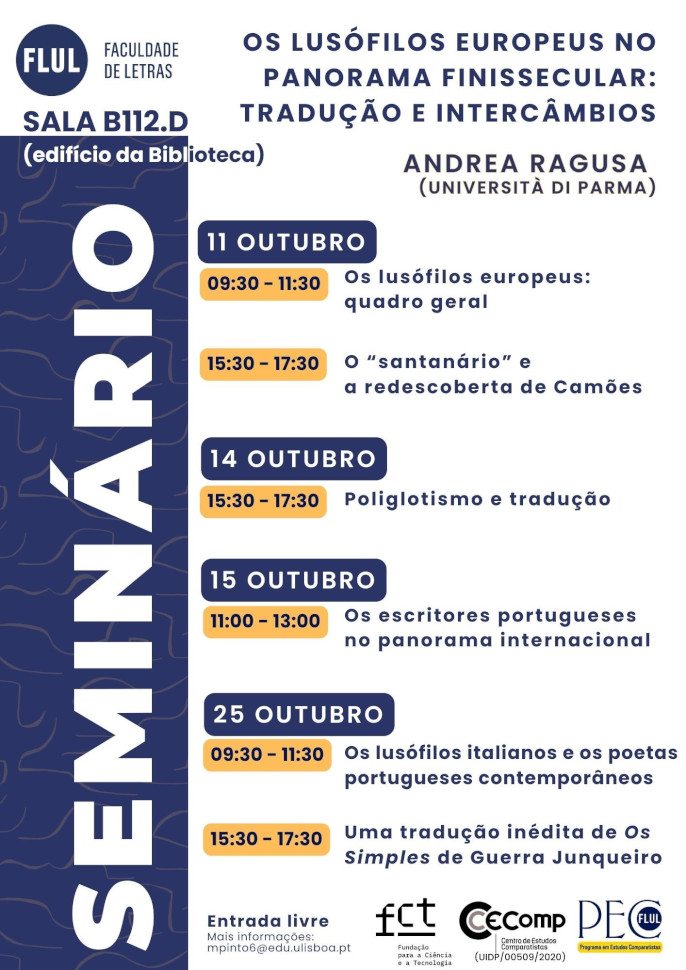 O Seminário "Os lusófilos europeus no panorama finissecular: tradução e intercâmbios" decorre entre 11 e 25 de Outubro de 2024 e está organizado em seis sessões, que serão orientadas por Andrea Ragusa (Universidade de Parma). Está focado nos intercâmbios entre intelectuais e escritores de língua portuguesa e os “lusófilos” (ou “lusitanophilos”, como lhes chamava Teófilo Braga) europeus. Depois de uma definição geral da matéria de estudo, será aprofundada a relação entre o Centenário camoniano de 1880 – ironicamente definido “santanário” na altura – e a redescoberta de Camões pela Europa fora, fenómeno paralelo ao surgimento de inúmeras edições e versões em outras línguas, tanto do poema como da lírica. A seguir será abordada a tendência “poliglota” desses lusófilos e a sua produção tradutológica, também em relação com as correspondências epistolares. A última parte do seminário será dedicada aos principais tradutores italianos na viragem entre os séculos XIX e XX (Cannizzaro, Teza, Padula, Peragallo) e à sua produção, com atenção especial para a análise textual da tradução italiana (inédita) de Os Simples de Guerra Junqueiro, realizada pelo erudito siciliano Tommaso Cannizzaro.