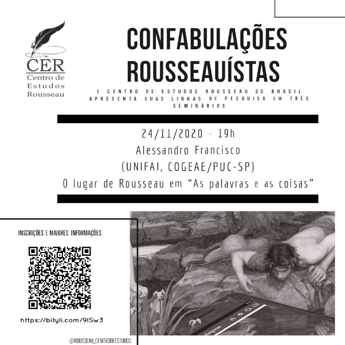 Em continuação à série de seminários Confabulações Rousseauístas, em que apresenta suas linhas de pesquisa, o Centro de Estudos Rousseau do Brasil- CER convida a todos para o encontro O lugar de Rousseau em As palavras e as coisas , com Alessandro Francisco (UNIFAI, COGEAE/PUC-SP) no dia 24/11/20 às 19h.