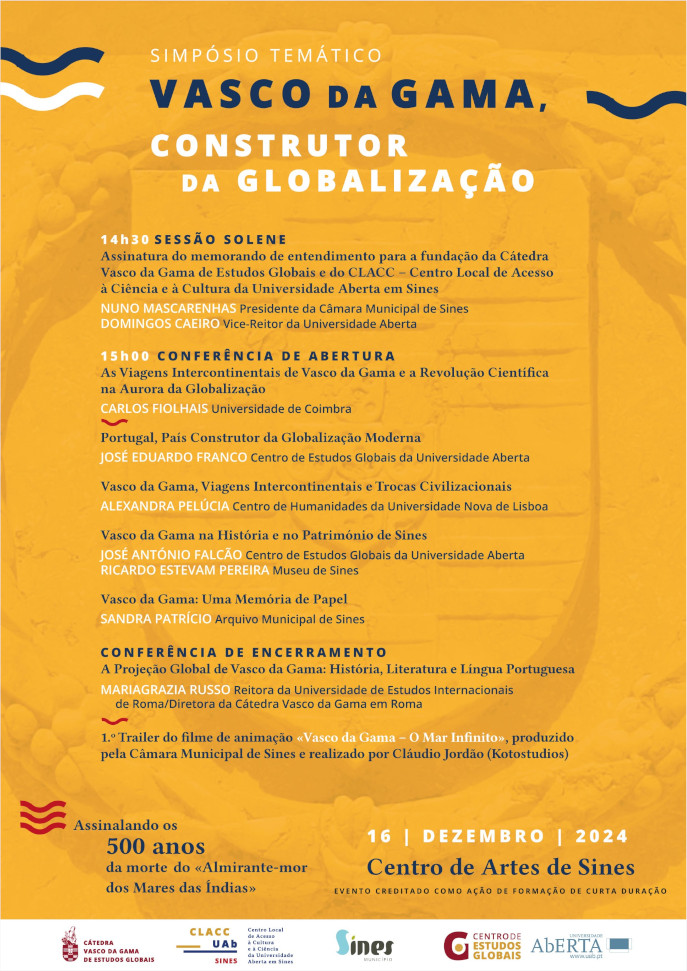Realiza-se no próximo dia 16 de dezembro, às 14h30, o Simpósio Temático "Vasco da Gama, Construtor da Globalização", organizado pelo Centro de Estudos Globais da Universidade Aberta em parceria com o Município de Sines.