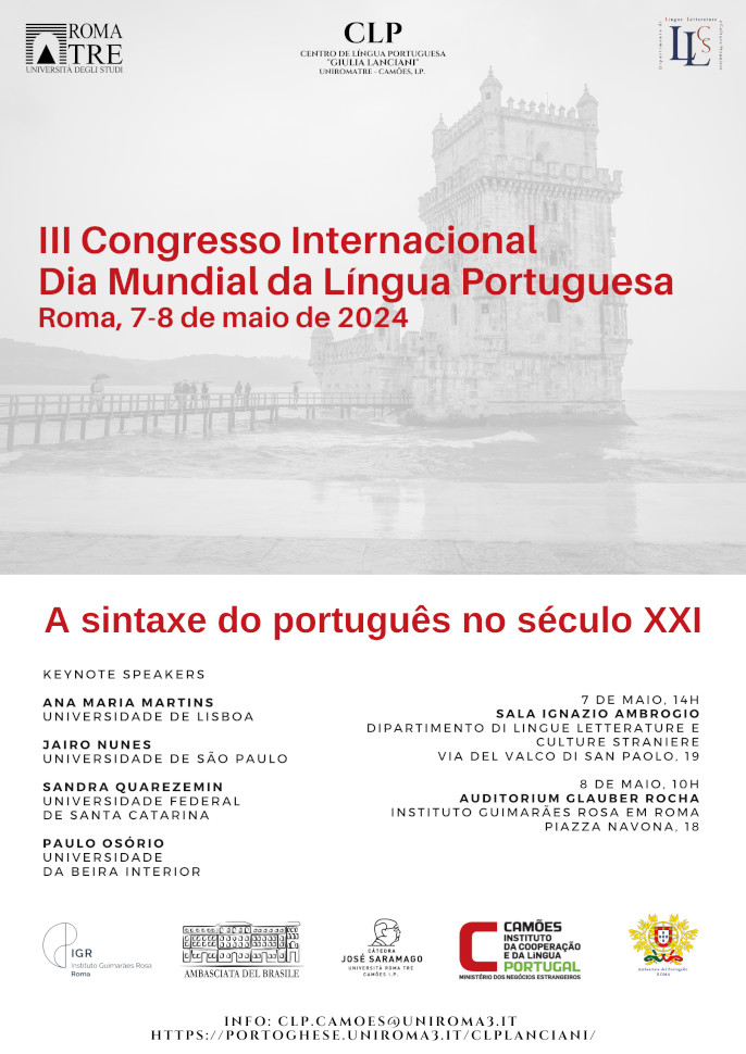Il congresso, che si terrà nei giorni 7 e 8 maggio presso lUniversità Roma Tre e l’Instituto Guimarães Rosa em Roma, riunisce studiosi italiani e stranieri che si dedicano allo studio della sintassi portoghese in ambito accademico e prevede una tavola rotonda dedicata alla sintassi del portoghese europeo e del portoghese brasiliano.