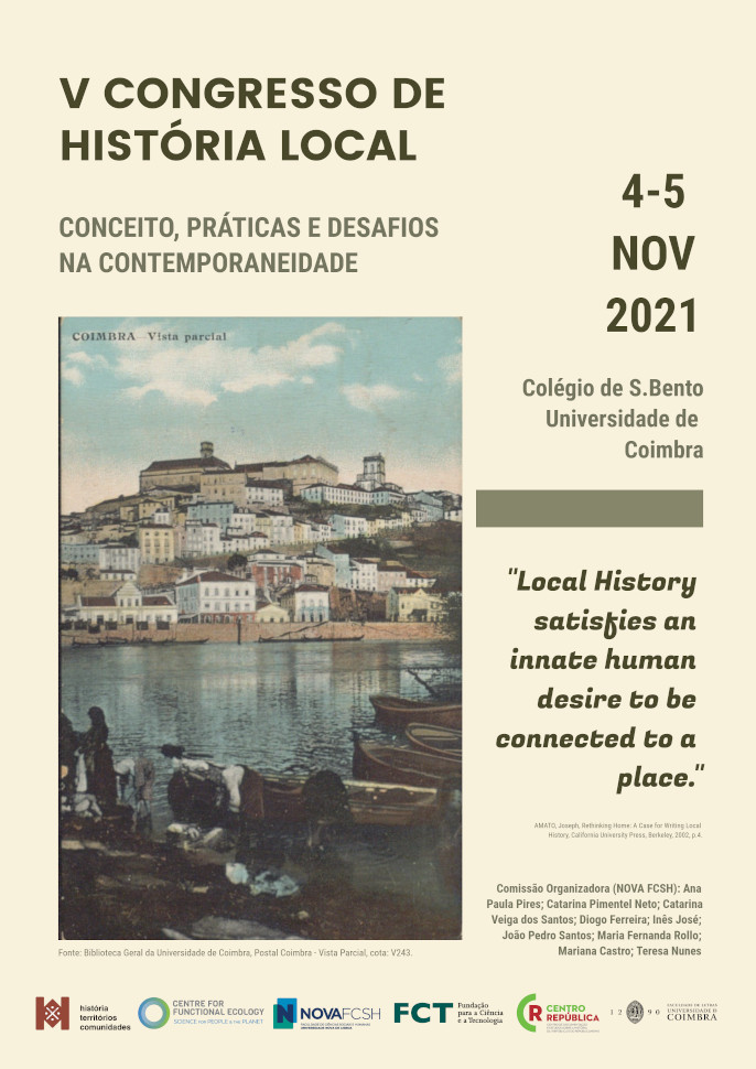Neste sentido, o V Congresso de História Local mantém o carácter anual e itinerante, criando as mesmas condições para que sejam apresentados múltiplos estudos sobre as mais diversas temáticas no âmbito desta área e assegurando o diálogo permanente entre a investigação histórica local e a historiografia nacional e internacional. É de realçar que, na última edição (Almada, 2020), mantivemos a iniciativa dedicada à apresentação de trabalhos de investigação desenvolvidos por alunos de último ano de licenciatura e de primeiro ano de mestrado, prática que, pelo acolhimento obtido, continuará nesta edição de 2021.