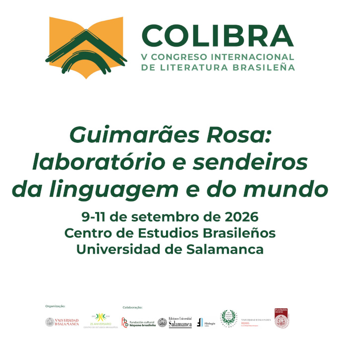 V Congresso Internacional de Literatura Brasileira. Guimarães Rosa: laboratório e sendeiros da linguagem e do mundo O Centro de Estudos Brasileiros, em colaboração com a Academia Brasileira de Letras, organiza o V Congresso Internacional de Literatura Brasileira. Homenagem a Guimarães Rosa, que acontecerá entre os dias 9 e 11 de setembro de 2026 na Faculdade de Filologia da Universidade de Salamanca. Neste V Colibra homenageamos João Guimarães Rosa (1908-1967), cuja poética está marcada pelo enigma, pela invenção formal, pela espiritualidade, pela violência, pelo humor e pelo enredo das complexidades históricas, constitui um espaço privilegiado para pensar o Brasil e o humano sob focalizações sempre renovadas. Convidamos a todos os pesquisadores e pesquisadoras da vida e obra rosiana a participar do congresso com uma comunicação, assim como o evento também está aberto aos pesquisadores de Literatura brasileira em geral. As pessoas interessadas em participar do Congresso podem enviar as propostas de comunicação em espanhol ou em português até 21 de junho de 2026. As propostas devem adequar-se a alguma das linhas temáticas indicadas Toda a informação no website do Cebusal, aqui.